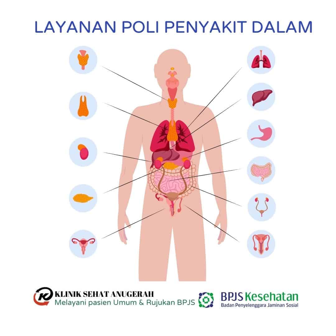 Poli spesialis penyakit dalam Klinik Sehat Anugerah, menangani berbagai keluhan dan masalah kesehatan pada pasien dewasa dan lansia.Penanganan yang dilakukan mencakup semua organ tubuh bagian dalam, seperti sakit kencing manis, darah tinggi, sakit lambung (maag), sakit saluran pencernaan, liver,dll